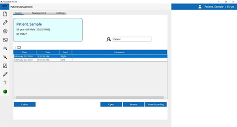 FootVIEWは、圧力センサの記録を整理・保存するための専用インターフェースを提供します。ソフトウェア上で患者リストを管理でき、測定データは各患者の記録に自動でリンク・保存されます。