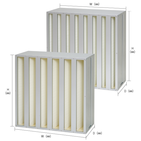 厚さ(D):292mm、ガラス繊維ろ材を糸状セパレータに用いて折り込んだ材パックをV字状に配置し、ろ材面積は従来セパレータ型の約2倍!多風量・長寿命を実現したセル型準HEPAフィルタです。