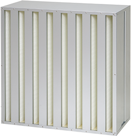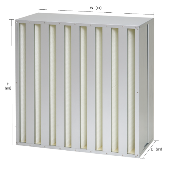厚さ(D):292mm、ガラス繊維ろ材を糸状セパレータに用いて折り込んだ材パックをV字状に配置し、ろ材面積は従来セパレータ型の約2倍!多風量・長寿命・低圧損を実現したセル型HEPAフィルタです。