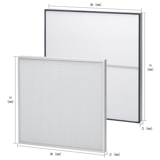 厚さ(D):52mm・68mm・86mm・100mm、ガラス繊維ろ材を糸状セパレータを用いて折り込んだ低圧力損失のパネル型HEPAフィルタです。厚さ68mmの薄型では、業界最速の面風速1.24m/sを実現!