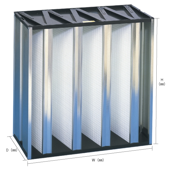 厚さ(D):292mm【塩害対策用】ガラス繊維ろ材を糸状セパレータを用いて折り込んだ材パックをV字状に配置し、ろ材面積は従来セパレータ型の約2倍!低圧力損失・長寿命を実現した中性能フィルタ。さらに、特殊成型樹脂フレームを採用し、軽量化を実現!