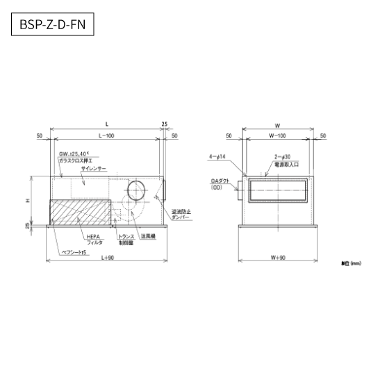 | オプション | 風量3段切替スイッチ(標準/PRE目詰り警報付)・温調コントローラー(タッチ式)・温調制御パワーユニット・差圧計・差圧スイッチ・吸込口ボックス(ダクト接続タイプのみ)・グループ制御盤・OAダンパー・手術室用連結仕様・積算タイマー | |