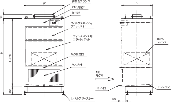 厚さ(D):500mm~750mm【HEPAフィルタ総合効率測定対応】汚染物質を捕集したHEPAフィルタの交換時に直接HEPAフィルタに触れることなく交換可能で、洗浄による飛散リスク低減。※HEPAフィルタリークスキャン対応。
